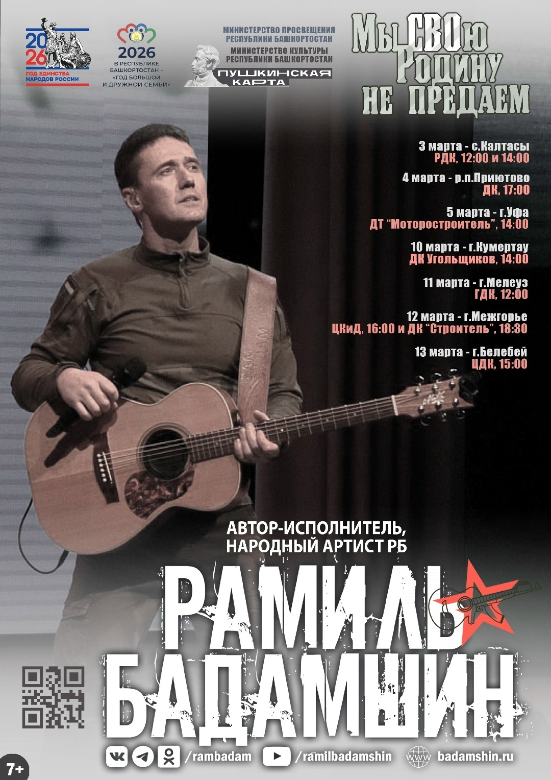 Весенний марафон патриотических концертов "Мы СВОю Родину не предаем" автора-исполнителя, народного артиста Республики Башкортостан Рамиля Бадамшина при содействии Союза мастеров сцены и АНО "Чистые помыслы" в поддержку наших отважных героев на передовой и патриотическое воспитание молодежи.